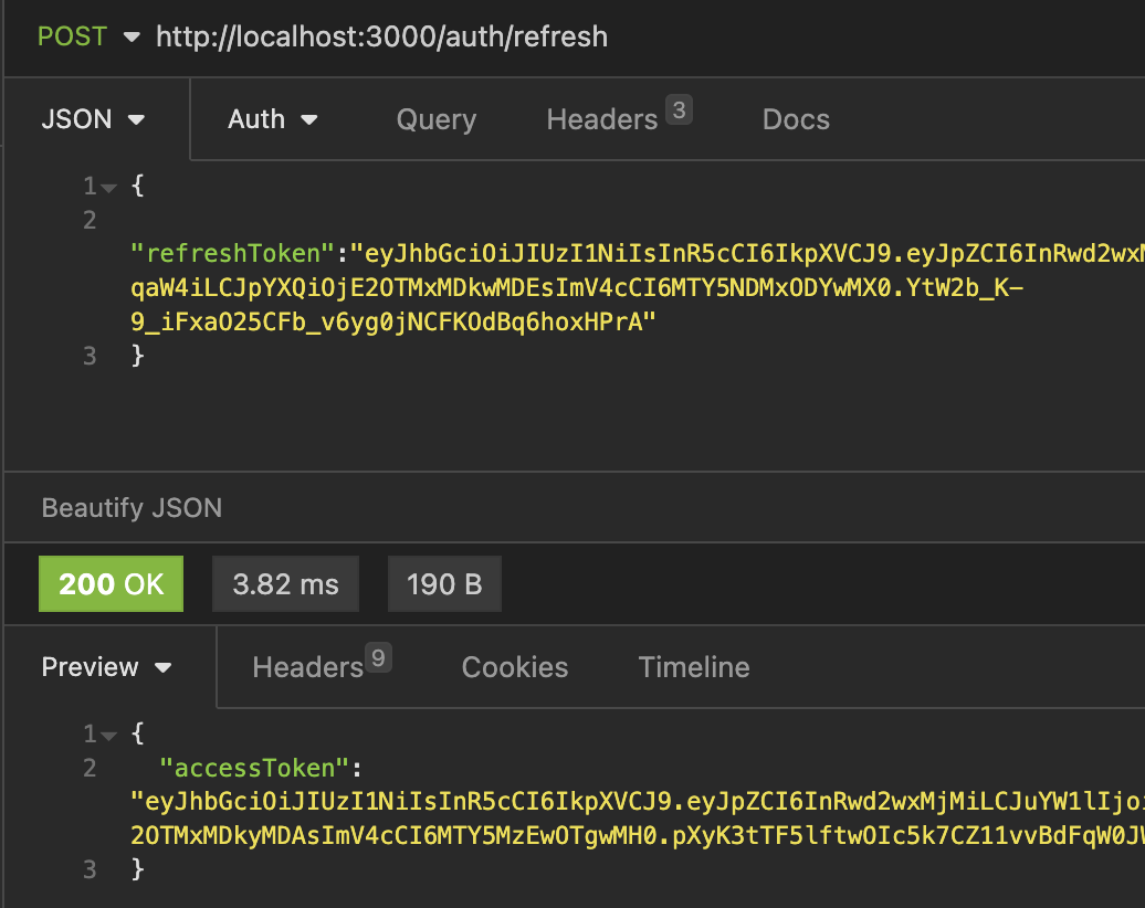 accessToken 없이 요청 시, 401 Error 발생로그인 성공 시, 클라이언트에게 accessToken, refreshToken을 반환발급 받은 AccessToken 값을 요청 헤더에 포함하여 요청 → 인증 가드 검증 성공accessToken 만료 시, 클라이언트는 발급 받은 refreshToken을 통해 새로운 accessToken을 발급