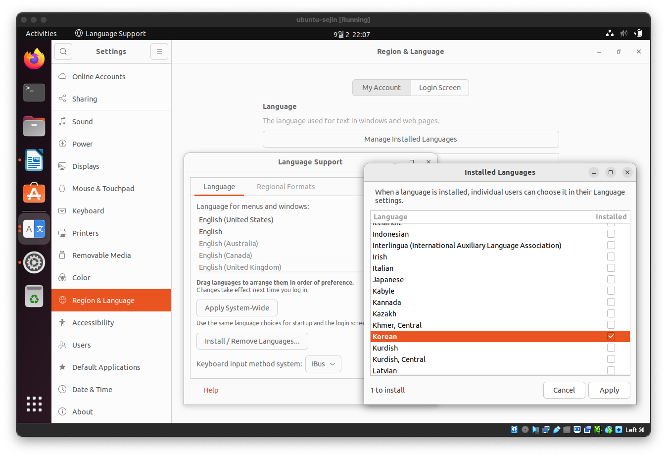 Settings - Region & Language - Manage Installed Languages - Install / Remove Languages... - Korean - Apply - Select Language (Korean) 선택 후, Restart