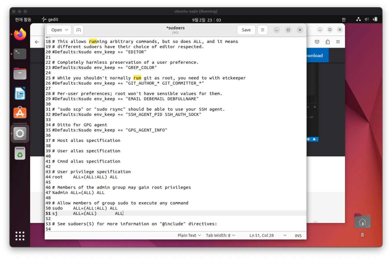 - 사용자명 ALL=(ALL) ALL 을 입력 공백은 탭으로 구분