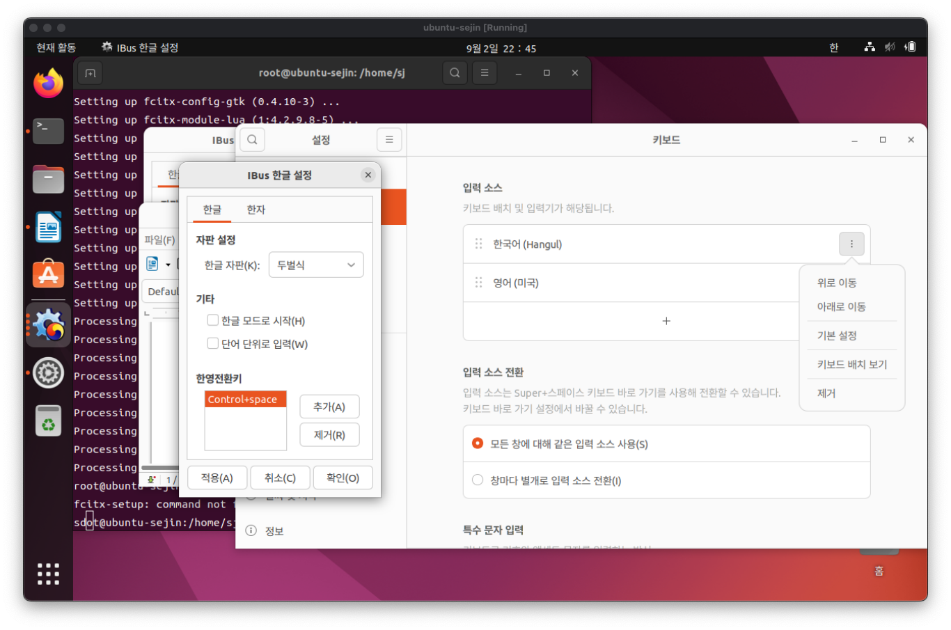 - 설정 - 키보드 - 입력소스에서 한영 전환키를 설정할 수 없었고, 터미널 ibus-setup을 통해 한영 전환키 설정을 했다. 하지만 이 설정을 통해 한영전환이 잘되지 않았다